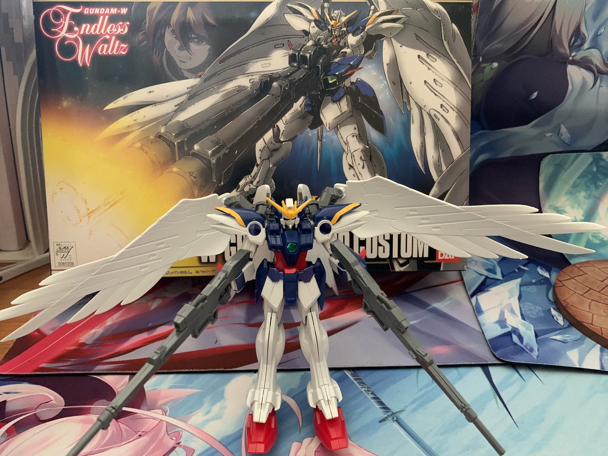 #ガンプラ #ガンプラ好きと繋がりたい #ガンプラの画像貼るとRTされると聞いて #ガンダムW パーツ見て時間がかからないと思って作ったぜ。HGウイングガンダムゼロカスタム作成!結構前の感じはするけどそれはそれでいいかも。やっぱこの翼が最高にかっこいいね。というか顔のシールどっかいっちゃった
