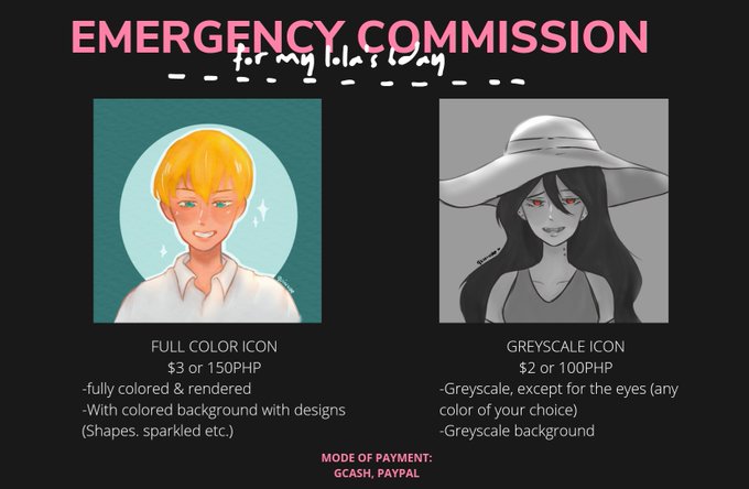 ‼️𝙀𝙈𝙀𝙍𝙂𝙀𝙉𝘾𝙔 𝘾𝙊𝙈𝙈𝙄𝙎𝙎𝙄𝙊𝙉𝙎‼️ My lola's 86th birthday is coming up and I want to buy her a cake 🎂 I need to raise atleast $20 (1000PHP) before october 30! DMs are always open 😊 RTs are greatly appreciated ❤✨ #commissionsopen #arttwt #ArtistOnTwitter #artshare