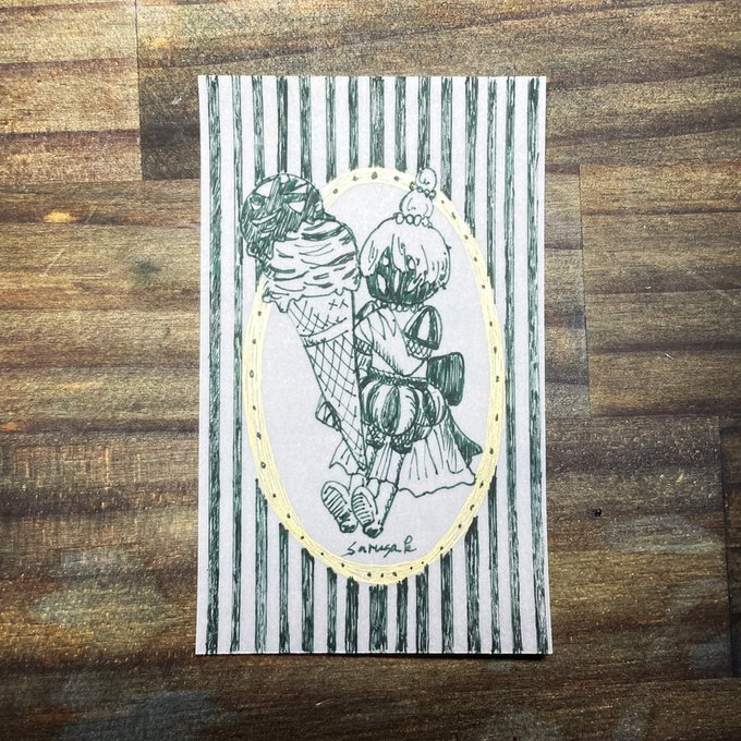 「double or triple」 『Decorate the cover 』チャリティミニ原画紹介。 これはトレーシングペーパーに直接描きました。透けます! 裏に遊び紙と称して無地の紙を入れて置いてます。意図せずですお迎えくださった人だけが透け感楽しめる形になってます笑 #ミニ原画 #落書きチャリティー