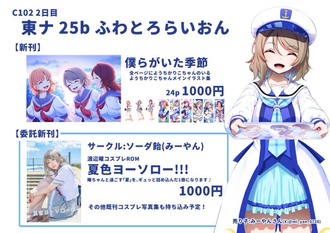 来週 #C102 のお品書きになります! なんと当日はみーやんさん(@mi_yan_0728)が曜ちゃんのみら僕衣装で売り子に来てくださります!🎉 あまきちゃんの新刊はメロンブックスでも通販予約行っておりますので当日来れない人は是非! 👇通販予約👇 melonbooks.co.jp/detail/detail.…