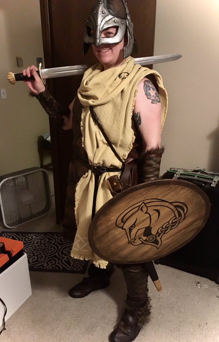 Still love my #Skyrim Whiterun guard #cosplay from 2018 It’s always a big hit at cons and I’ve heard more “arrow to the knee” jokes than i can count lol Especially proud of the shield, which I painted freehand on plywood #LegacyCosplay #OldCosplay