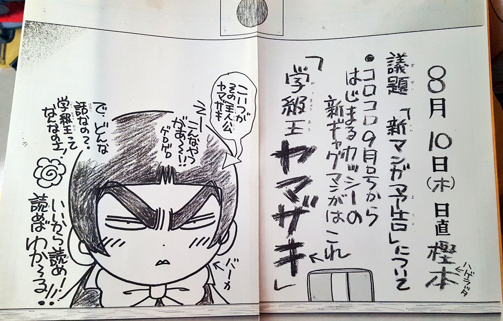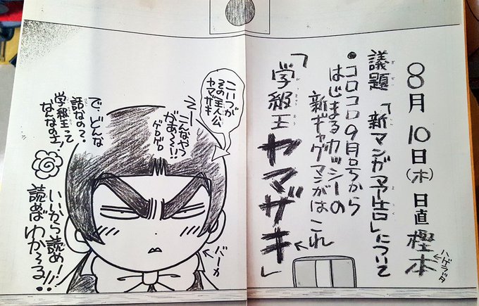 ヤマザキ取り上げていただきありがとうございます!この予告ページは私の手描きだったりします。学園ものということで黒板に描かれてるイメージで、黒マジックとクレヨンで描いたものを印刷で白黒反転していただきました。それにしてもヤマザキの顔も違うしまだ王冠型3本トンガリもないですね(笑) twitter.com/corocoro_tw/st…