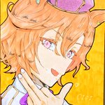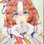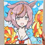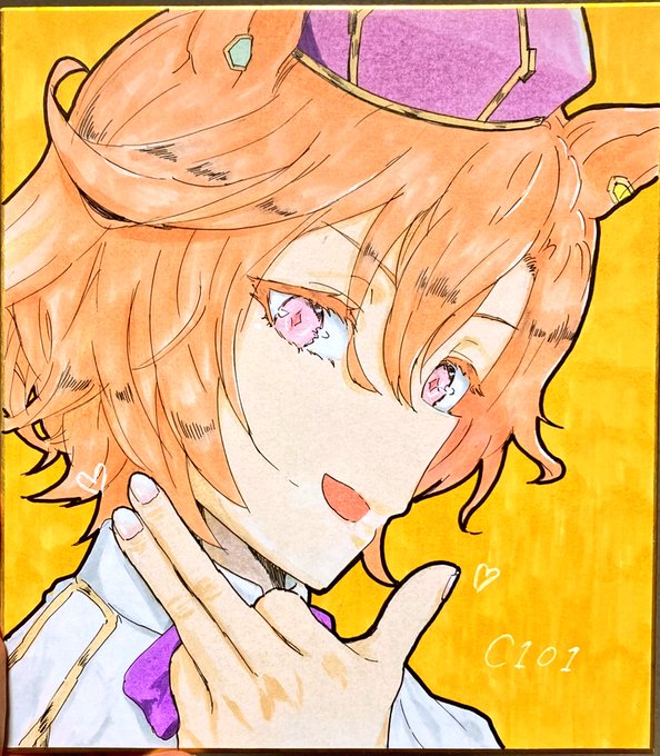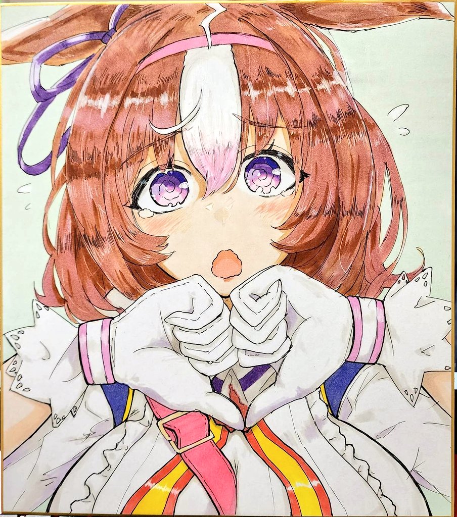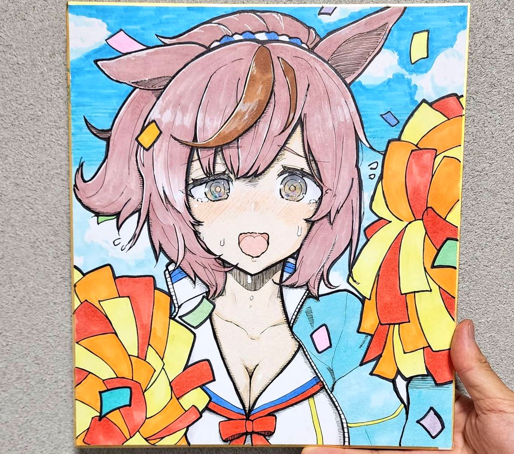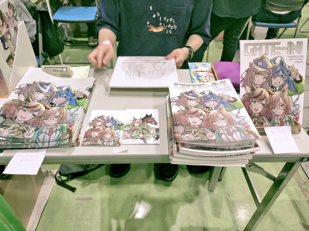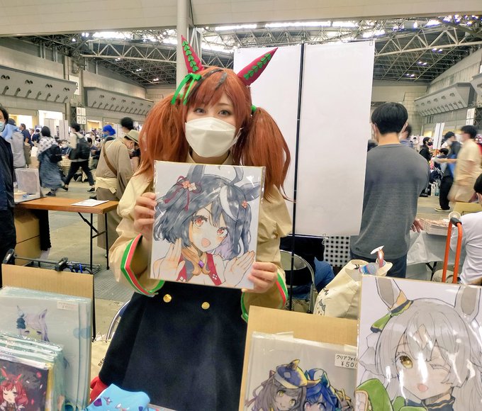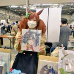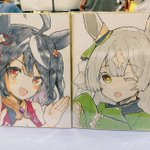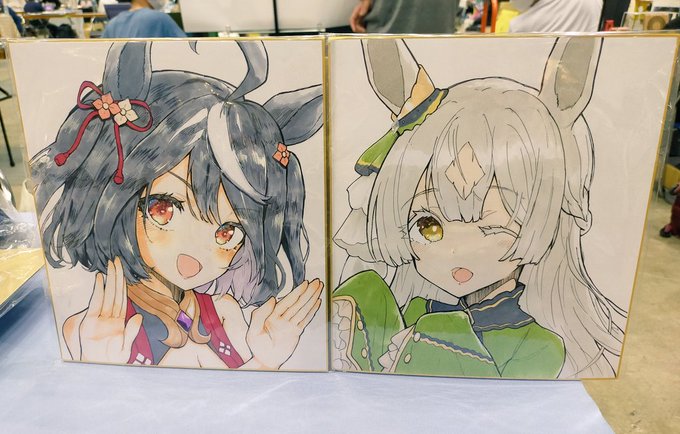 ただいま設営中〜! できたてホヤホヤ! キタサト色紙置いてます!! 初めてのアナログ塗りで大変だったけど楽しく描けました🤗 #C100 #ウマ娘 twitter.com/vwvwvwvwvwvwv/…