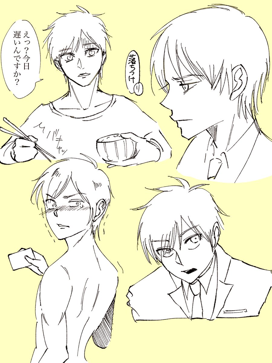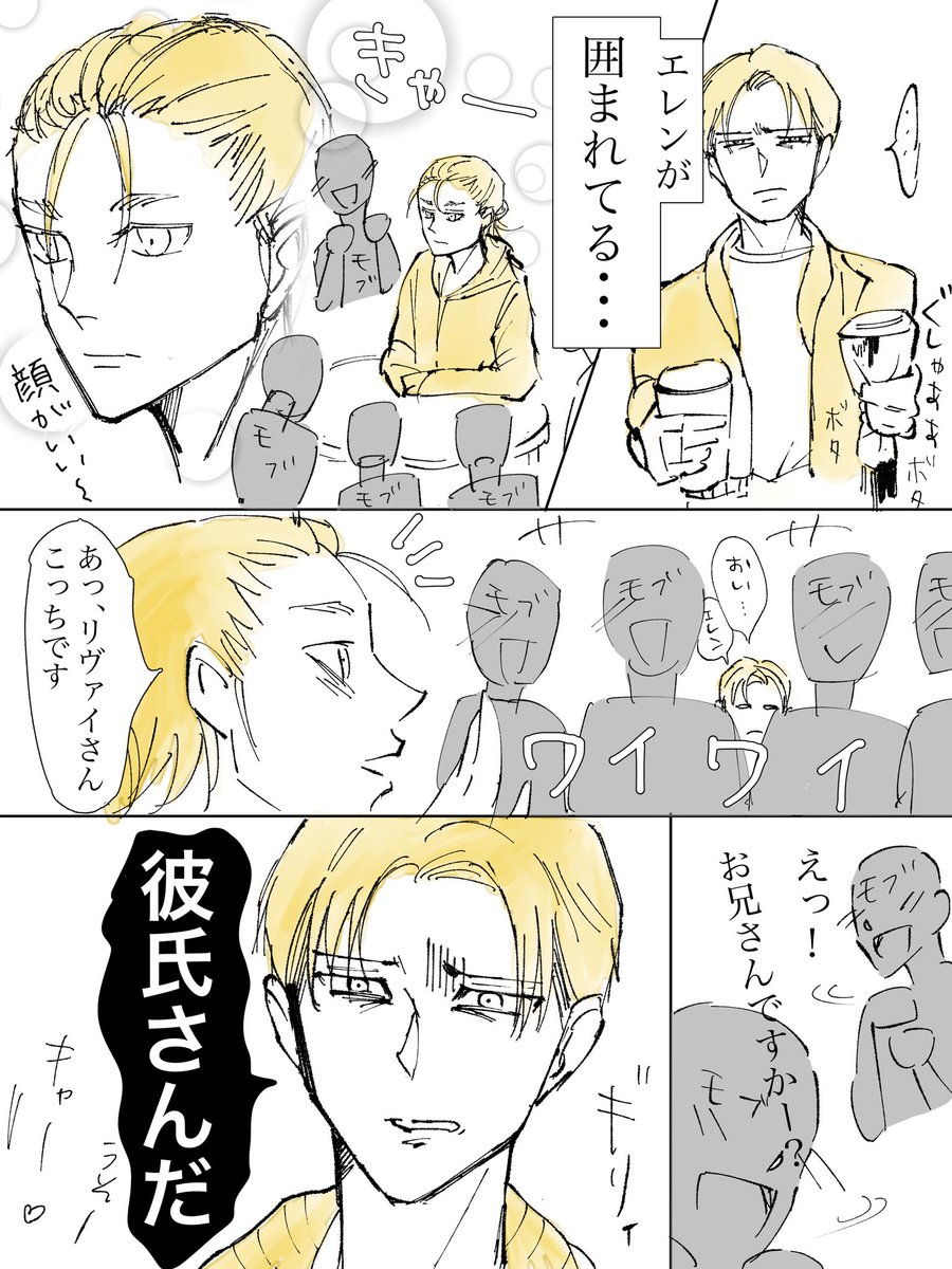 #リヴァエレ版ワンドロお絵描き60分1本勝負 【カフェ】22:00〜23:30 30分over カフェみたいな、人が多い所でデートすると顔が良すぎるエレンイェがすぐモブに囲まれちゃうから嫌なリヴァイさんっていう複雑な設定になってしまいました。