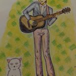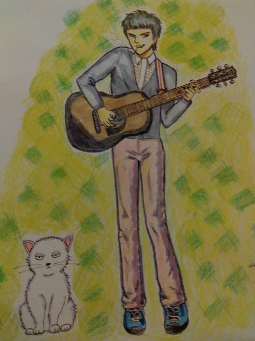 #色鉛筆画 ぱっつん方くん路上演奏with銀ネコw ハミング♫♫めっちゃいい声✨✨ 内股がPOINT ぱっつん前髪ならパンクファッションが合うかも知れん🖤💙💜🎤🧷