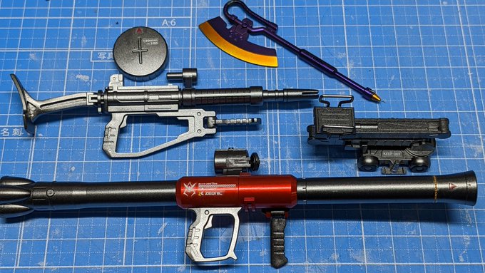 赤い彗星をつくる18 細かな部分塗装が残ってますが、武器類はこんな感じです。 飛び道具はスターブライトアイアンで。バズーカは一部独自色にしました🔴✨ ヒートホークの紫は黒下地からのアメジストパープルで🟣✨ #ガンプラ #ガンプラ好きと繋がりたい