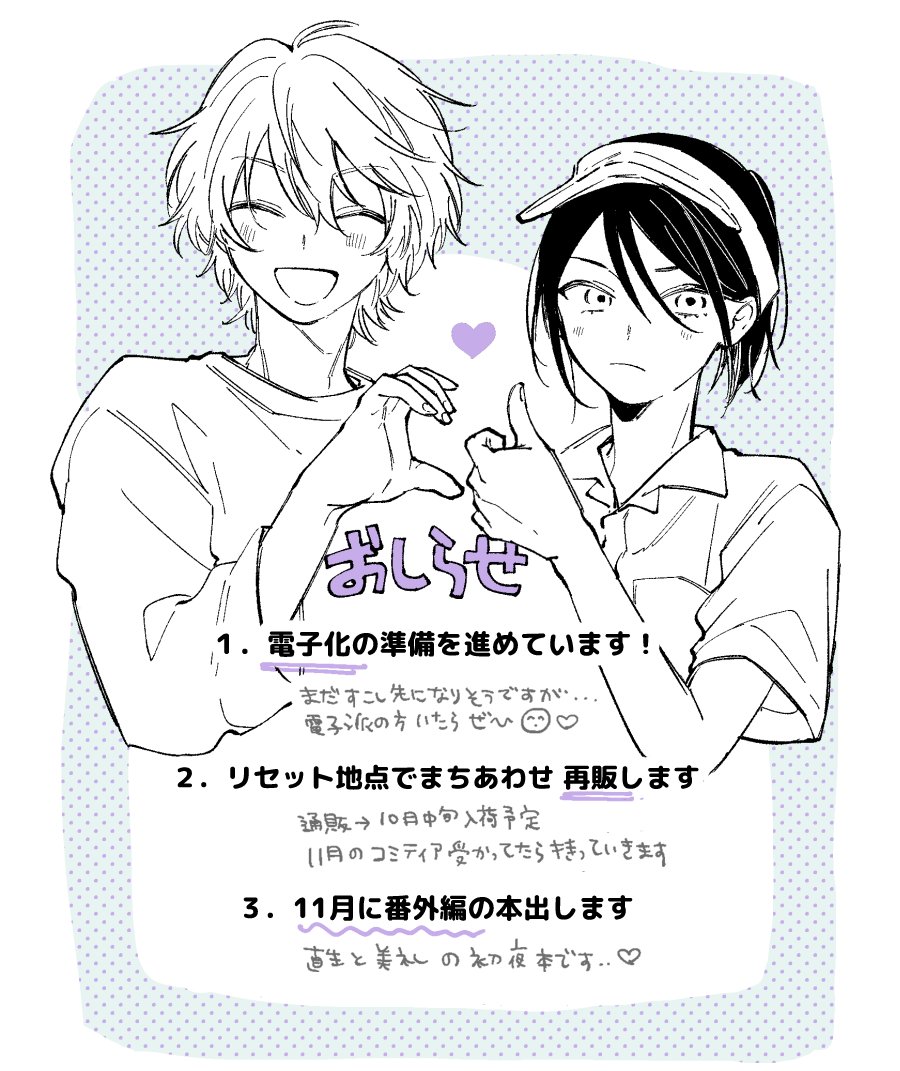 🌼おしらせ🌼 リセット地点でまちあわせ、再販分予約開始しました🐯→ecs.toranoana.jp/joshi/ec/item/… お届けは10月中旬頃の予定です。なんとこのさき電子化する予定もあるっぽい! 社会人×高校生BLご興味ありましたらよろしくおねがいします👨❤️👨 長めのサンプルはこちらで💁♀️pixiv.net/artworks/10045… #創作BL