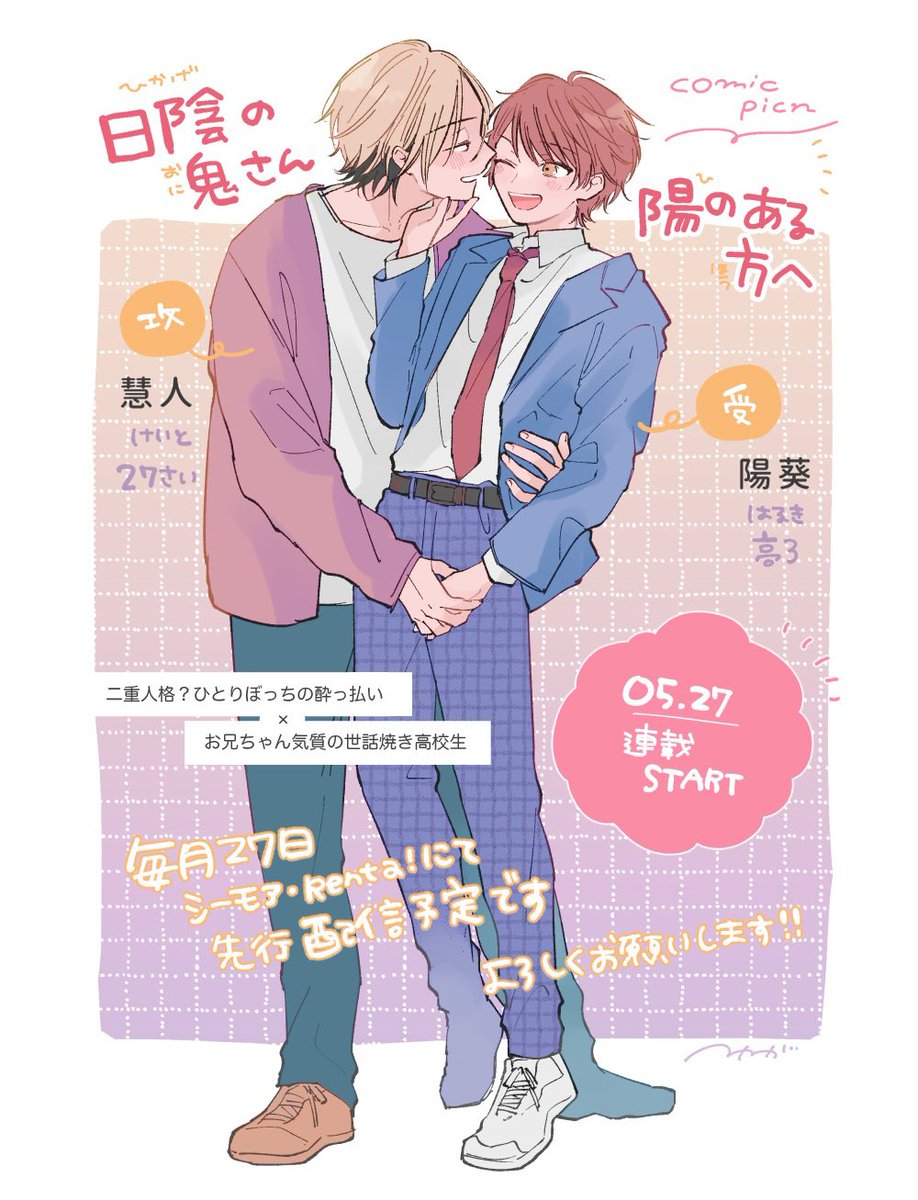 〖 おしらせ 〗 comic picn ( @comic_picn )にて、連載が始まります❕ ☁️ #日陰の鬼さん陽のある方へ 🌤️ 5月27日より、毎月27日配信予定ですᝰ✍️ 歳の差エモきゅんBL🫶 商業デビュー作になります😈よろしくお願いします!🧡