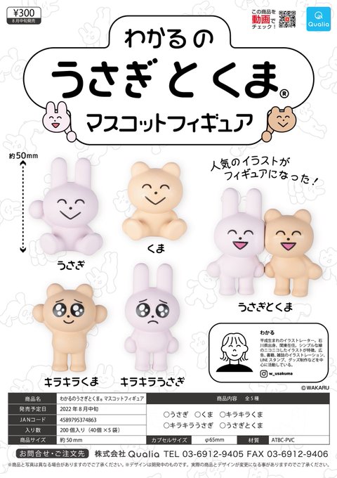 【 うれしいお知らせ!】 8月より、うさぎとくまのカプセルトイが発売されることになりました!1回300円、全5種。発売元は@Qualia_45_さんです。 取り扱い店舗などの詳細についてはまた後日お知らせします🐰🐻 #わかるのうさぎとくま #うさくま
