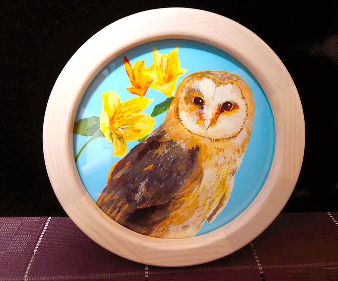1 7 【商品紹介】 ⑤「夏の花丸」 初丸型の額でせっかくなので、ho-ho-さんの看板フクロウちゃんと同じメンフクロウちゃんを描きました #夏フクフェス2021 21/07/24 16:57