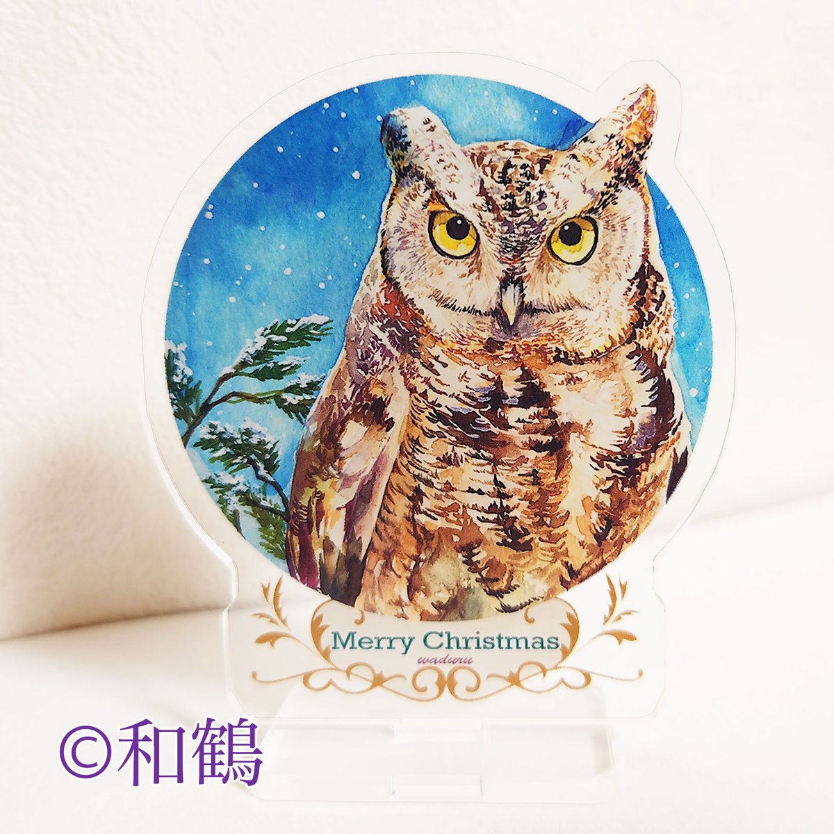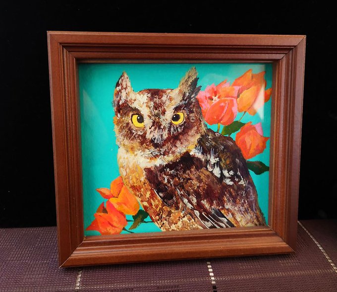 【商品紹介】 ⑤「夏の花丸」 初丸型の額でせっかくなので、ho-ho-さんの看板フクロウちゃんと同じメンフクロウちゃんを描きました #夏フクフェス2021
