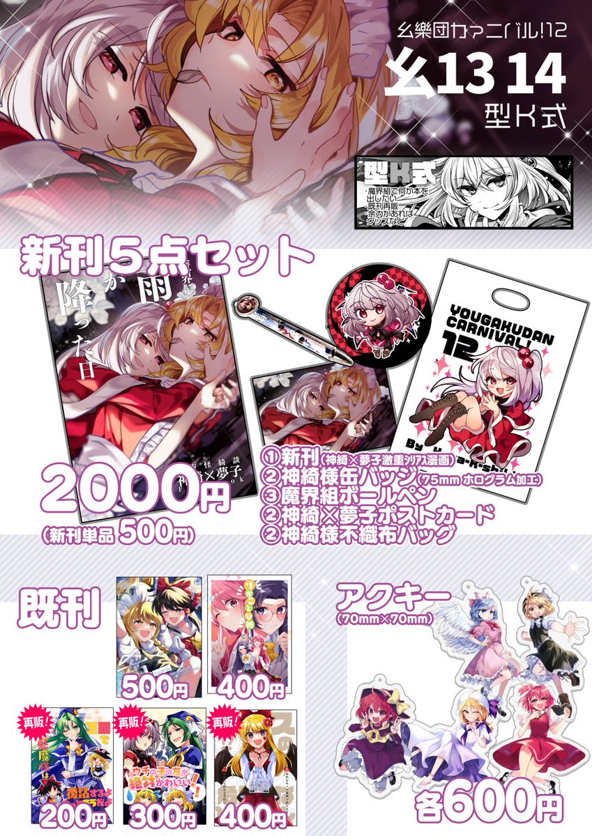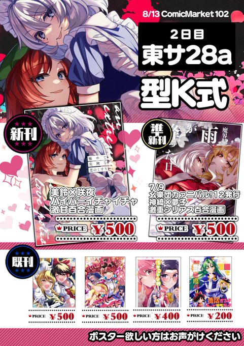 【C102お品書き】東サ28a 型K式 新刊『極めて危険な恋のくすり』500円 ■サンプルpixiv.net/artworks/11067… 準新刊『魔界に雨が降った日』500円 ■サンプルpixiv.net/artworks/10973… 当日掲示してるポスターは、欲しい方いらっしゃったら差し上げますのでお声がけください。 よろしくお願いします!
