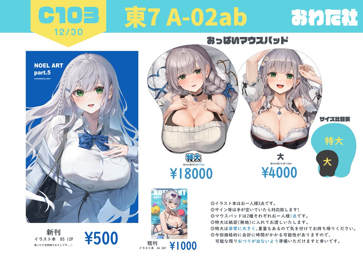 C103冬コミのお品書きです。 イラスト本とおぱマウです。 メロンブックスにて通販もあります。 ◆新刊 x.gd/xDhHv ◆"特大"おっマウスパッド(12/28 18:00予約開始) x.gd/7ggfw ◆既刊 x.gd/P5Bzn ※"大"おっマウスパッドは通販分はすでに無くなっています🙏… twitter.com/i/web/status/1…