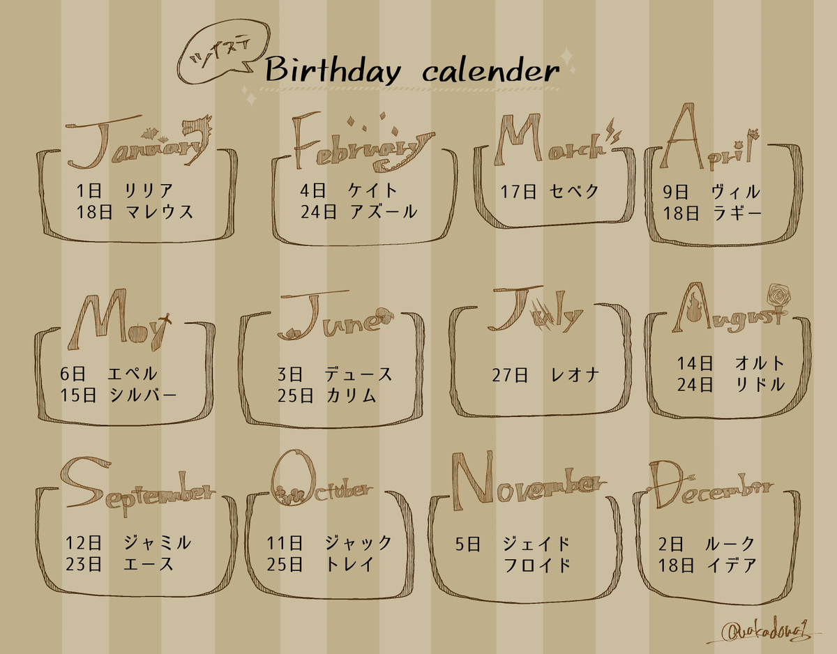 毎度毎度キャラの誕生日忘れてしまうので自分用にツイステのキャラの誕生日表作った← 需要あるかわからんけど月のところ各キャラでデコってみたから見てほしい☺️☺️☺️ #ツイステファンアート