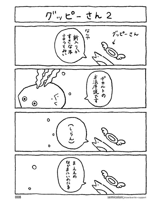 引っ越してきた水そうには、先に住んでいるお魚さんがいました。 関西弁を喋る彼の名前はグッピーさん。 ごあいさつをしっかり出来ない相手はゆるさない、厳しい性格。 するどい声色での質問に、わかめいしさんは━━!? #漫画が読めるハッシュタグ #日常 #謎の生き物