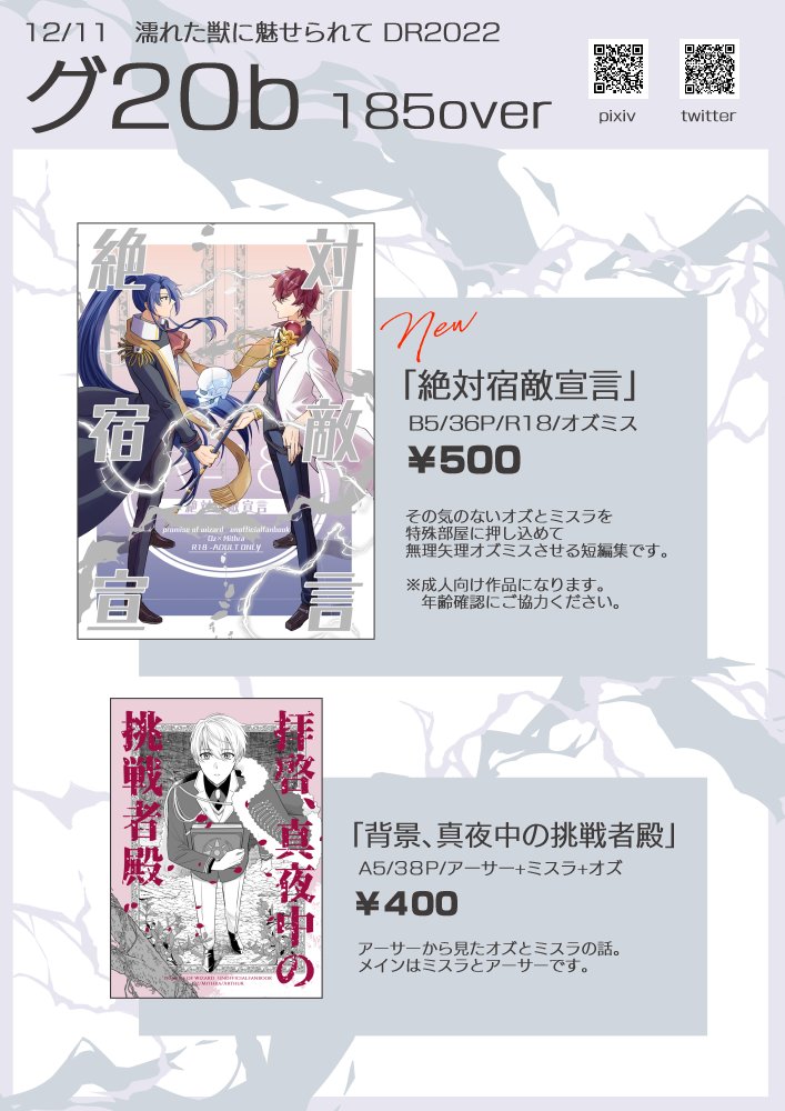 6 6 12/11 濡れた獣に魅せられて 東6 グ20b / 185over お品書きです。よろしくお願いします~! pixiv.net/artworks/10350… 22/12/11 00:38