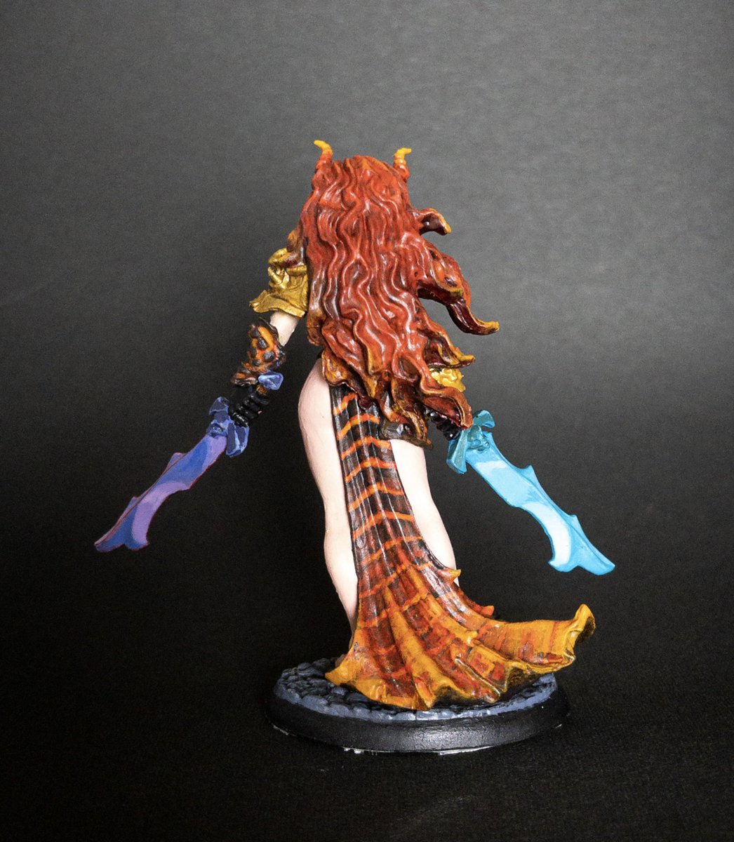 Reaper 44003 Ziba,Female Efreetiをドーラ様にしてみた。元ミニチュアのいかにも鬼神な顔つきを、パテで前髪足して、可能な限り美人に…。剣はマイクラのダイヤ剣とエンチャ剣っぽく。身の丈4mの半人半竜形態、イメージは「ダクソに出てたころのドーラ様」。 #ドーラの宝物庫 #miniaturepainting
