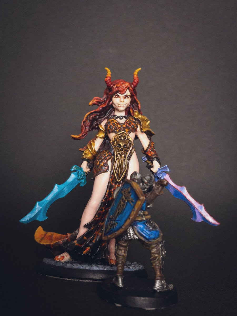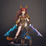2 23 Reaper 44003 Ziba,Female Efreetiをドーラ様にしてみた。元ミニチュアのいかにも鬼神な顔つきを、パテで前髪足して、可能な限り美人に…。剣はマイクラのダイヤ剣とエンチャ剣っぽく。身の丈4mの半人半竜形態、イメージは「ダクソに出てたころのドーラ様」。 #ドーラの宝物庫 #miniaturepainting 21/04/19 22:00