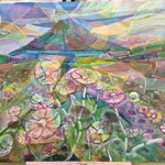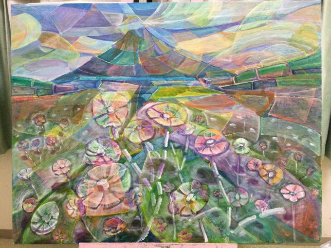 3 4 #油彩画 #油絵 #ミルフィーユ画法 #コスモス畑と富士山 2023.6.3途中経過 23/06/03 23:35