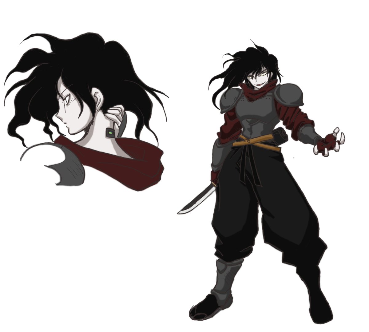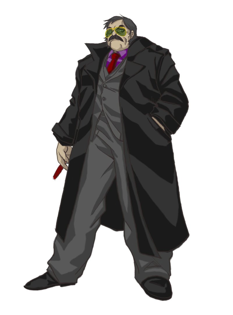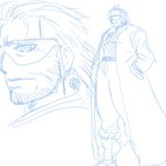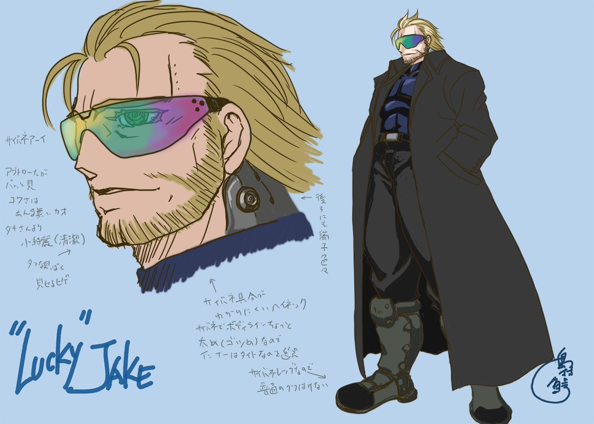 #ニンジャスレイヤー ジェイク……不法入国ガイジン、重サイバネ)))「身長185前後……脳内UNIXの自動翻訳により不確かな日本語……サイバネを隠すため品の無いコートとサングラス着用……」 #ウキヨエ #下書き