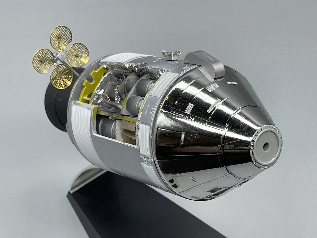 & GPの連載で製作中のドラゴン1/72 アポロ13号。 爆発で破損した内部や吹き飛んだパネルも不鮮明な写真が1枚あるだけなので、こんなんじゃないかとイメージ優先で自作してます。 真空中での酸素タンク爆発って、やっぱり焦げて煤けるんでしょうか?