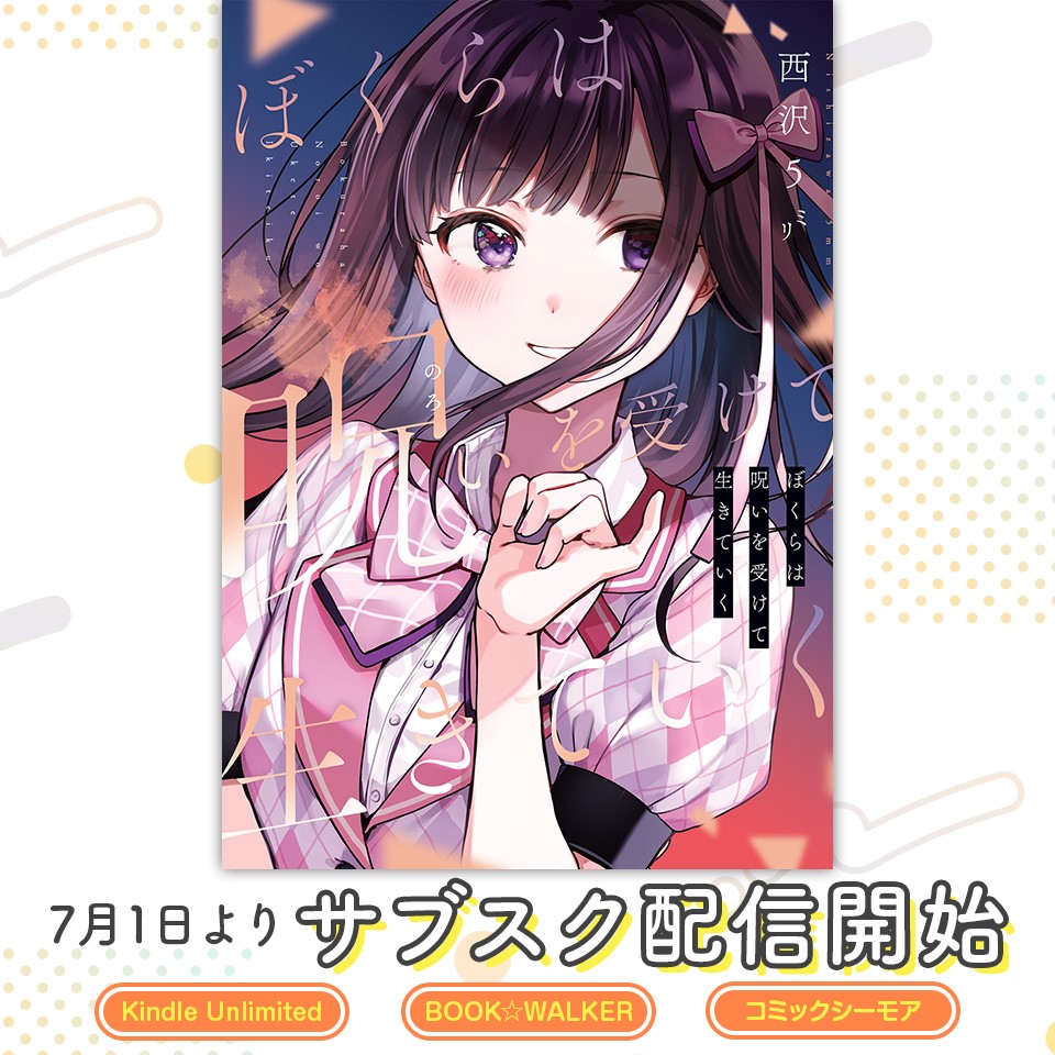 『ぼくらは呪いを受けて生きていく』の電子書籍が本日7/1より 以下ストアの読み放題サービスにて配信開始しました! サブスク会員の方は読み放題ですので、ぜひよろしくお願いします! ・Kindle Unlimited:amzn.asia/d/ifTq2g3 ・BOOK☆WALKER:bookwalker.jp/de8bf7efa6-ee6…… twitter.com/i/web/status/1…