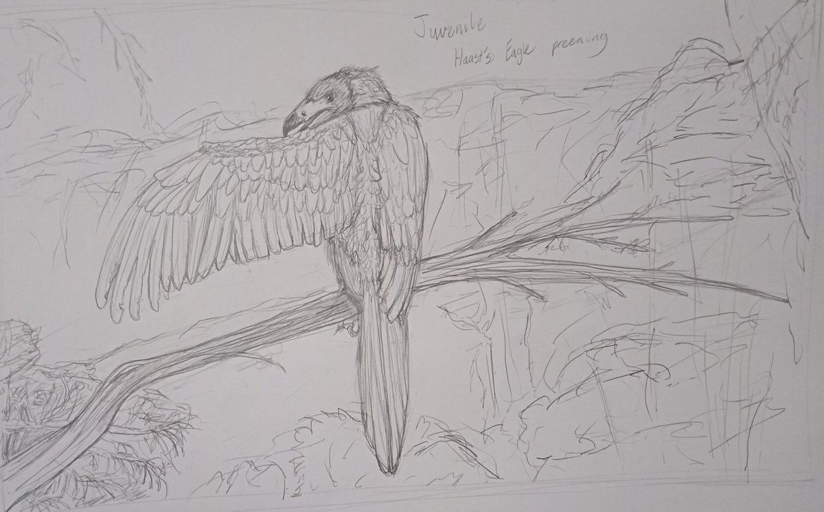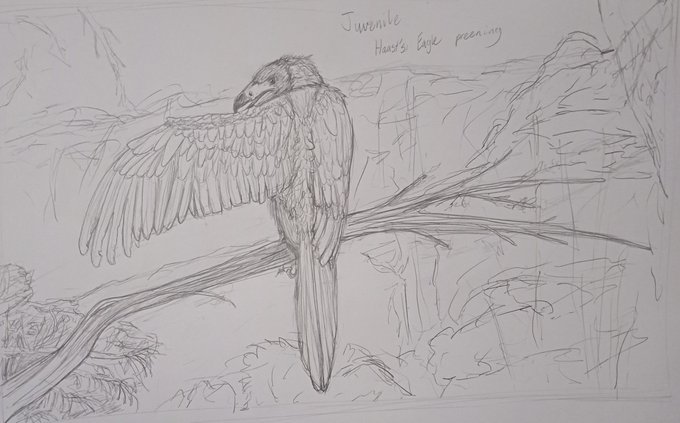 Quick Haast’s Eagle sketch, depicting a juvenile preening on a Kauri tree in New Zealand. #paleoart #paleontology #sketch #ArtistOnTwitter #birds #HaastEagle #drawing #NewZealand