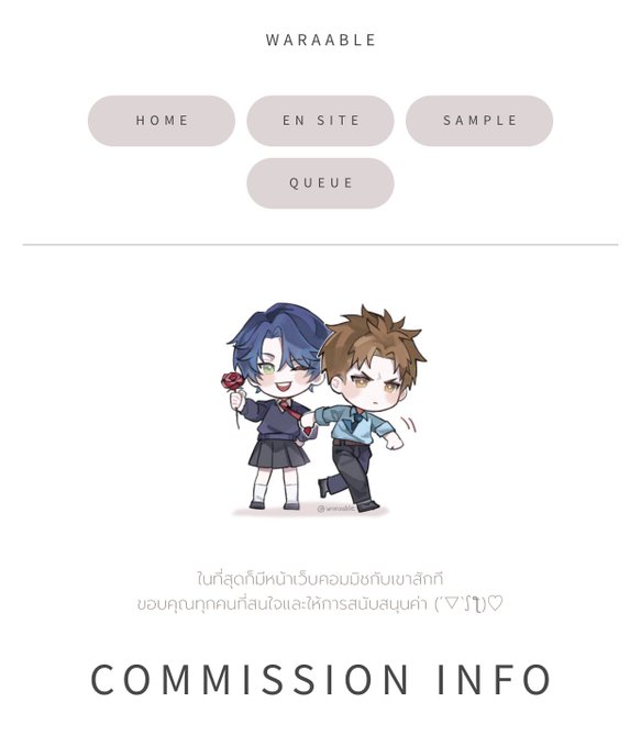เพิ่งเคยมีแบบฟอร์ม commission ครั้งแรก TvT !! ฝากไว้ด้วยค่า🙏 ยังไม่สมบูรณ์ดีแต่ใครสนใจเชิญเข้าไปส่องได้นะคะ ปี 2023 คิวว่างต่อไปเดือนกุมภาค่า ช่วงนี้สนใจหัดวาดพวกฉาก-บรรยากาศ ใครอยากได้งานแนวนี้มาจ้างอิฉันได้นะคะ อิฉันอยากฝึก 💦 waraable.carrd.co