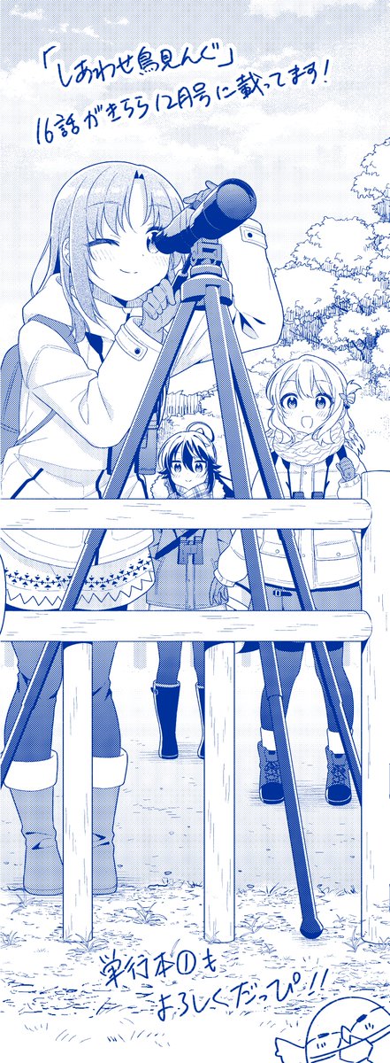 今月のきららにも「しあわせ鳥見んぐ」載ってます。 いざフィールドスコープでの野鳥観察…!🦆✨ 単行本①巻も発売中です。グッズや色紙が当たるキャンペーンも開催中なのでよろしくお願いいたします!😉