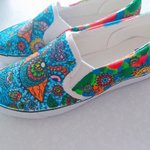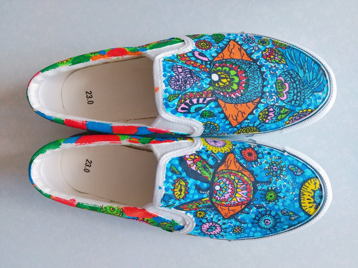 タイトル『始まる世界』 オリジナルキャンバス地スニーカーです👟 布絵の具と爪楊枝を使いカラフルに色を塗りました🎨 #minneで販売中 #minne のURLはこちら minne.com/714714714 #オリジナル #イラスト #スニーカー #キャンバス地 #キャンバス地スニーカー #靴 #作品 #ミンネ #minne販売