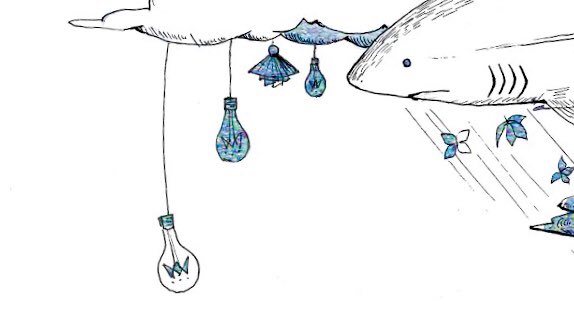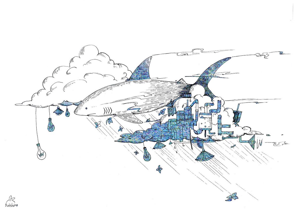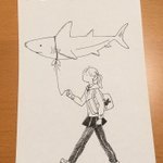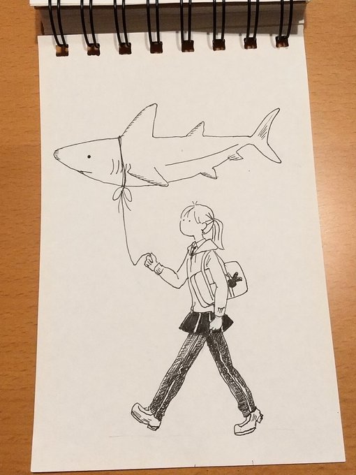 最近のペン画ら、 PCで何描こうかなぁと考えていると、たまにそのままペン入れが始まる🤔 紐で繋ぐシリーズ 1 うちのサメ、校門まで迎えに来る 2 うちの子ヒトのお散歩デビュー 3 たこあげは最初の疾走が大事 4 紐つけるとこ変えたら揚がったたこ #アナログイラスト #ペン画
