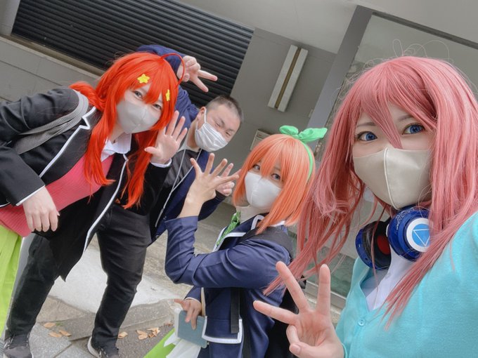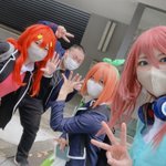 #ふくしま街コス 今日前半は五等分の三玖💙 四葉💚五月❤️も一緒です☺️ 風がだんだん強くなる〜😭💦 カメラのしゅきぽは二乃推し…💜これから食べ物を調達してくるぜよ☺️💕