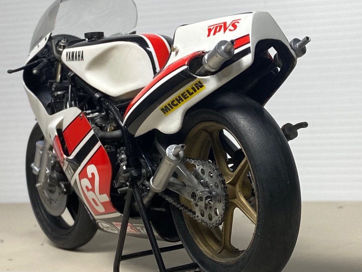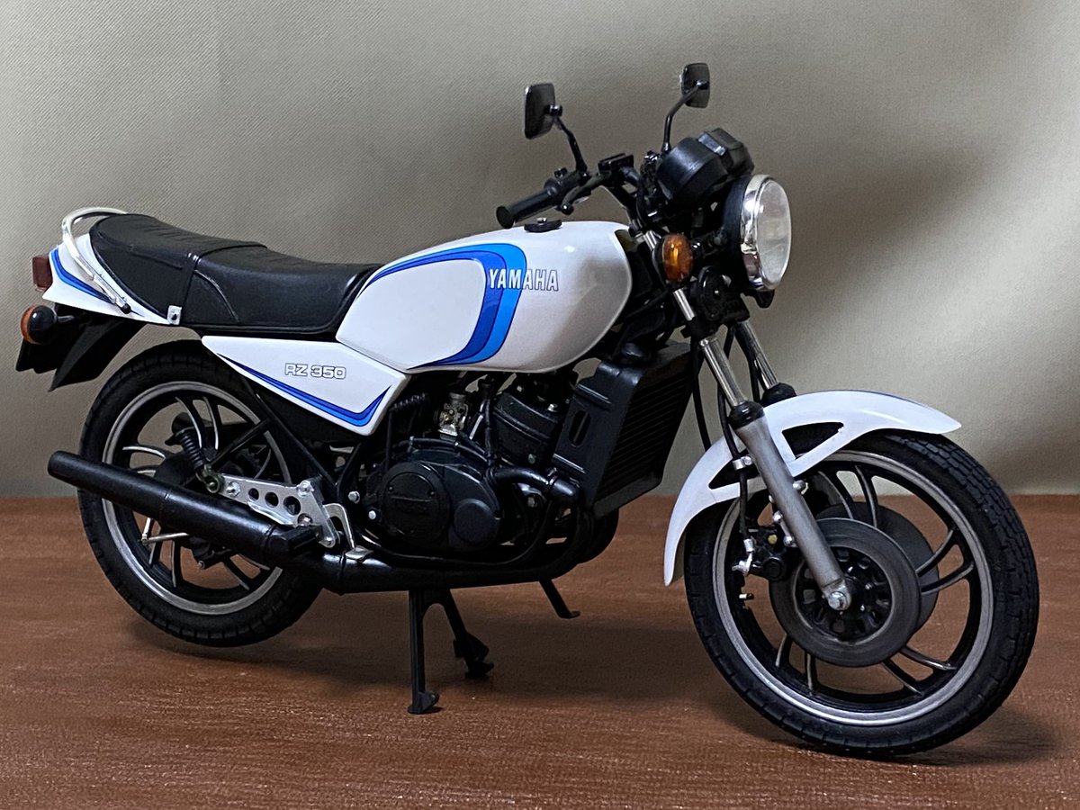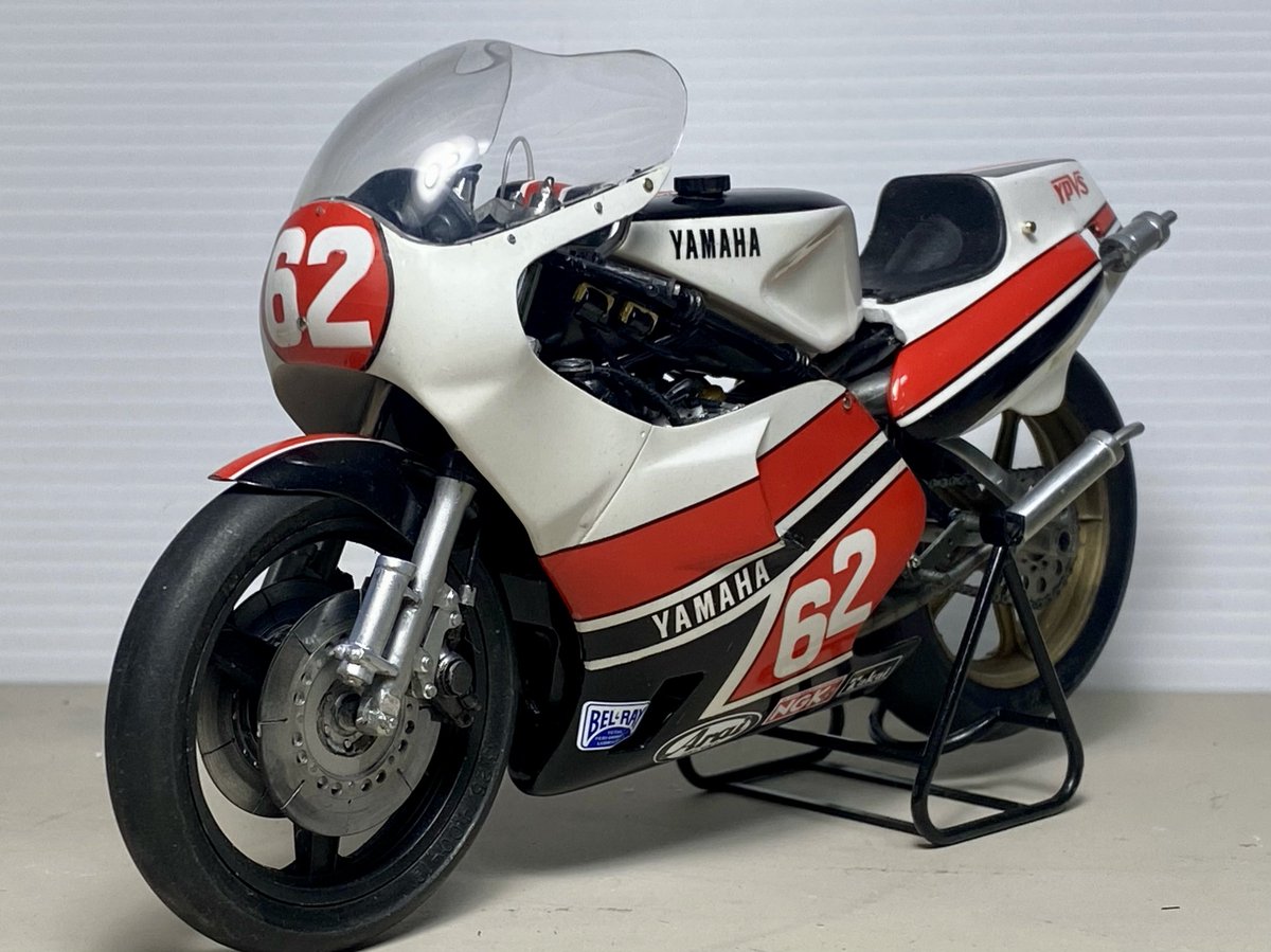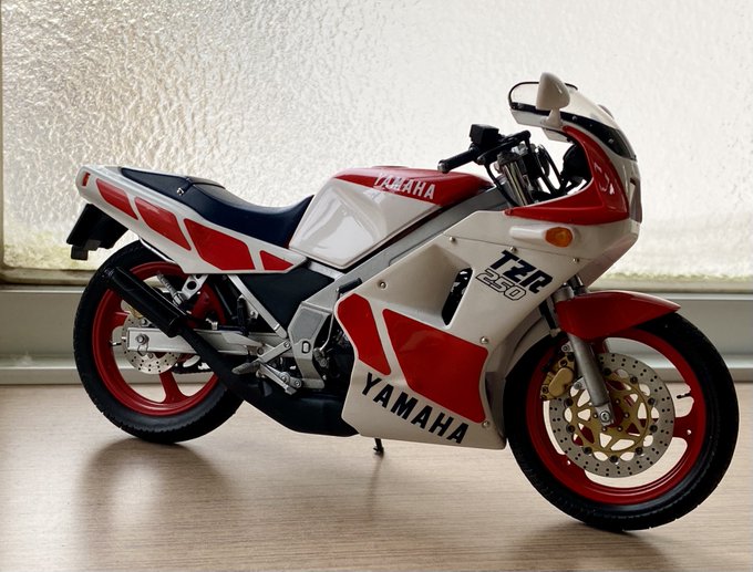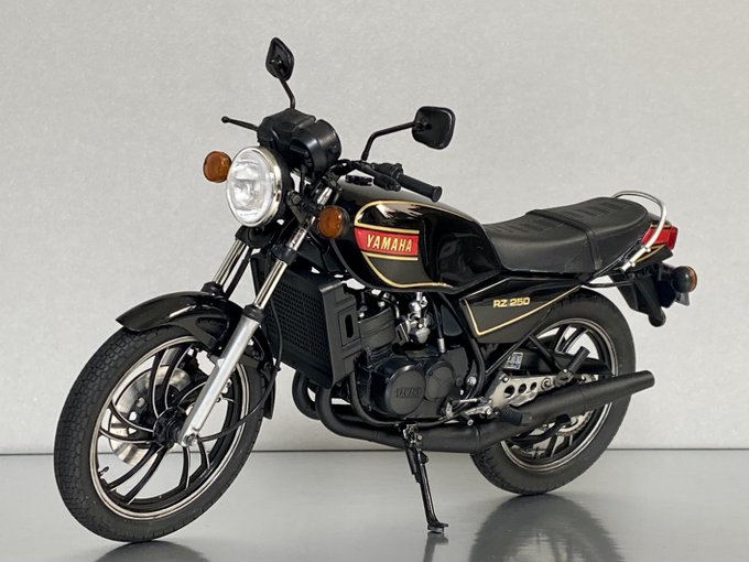 ハセガワRZ250 じっくり眺めると 樹脂製パーツはもっと薄く吹けばよかったな デカールは貼り終わり直後にシワとシルバリングを良く見ておけばよかった なあと反省😞 次に活かします! #今月作ったプラモを晒そうぜ