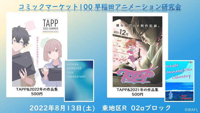 早稲田大学アニメーション研究会は明日の12月31日西"ぱ"24aに出展します! 自主制作アニメを収録したDVDとその制作記録を載せたサークル誌「TAPP」を頒布予定です!boothにて頒布した2020・2021夏の作品集+TAPPもございます! 是非お越しください🙌 #C99 #C99WebCatalog