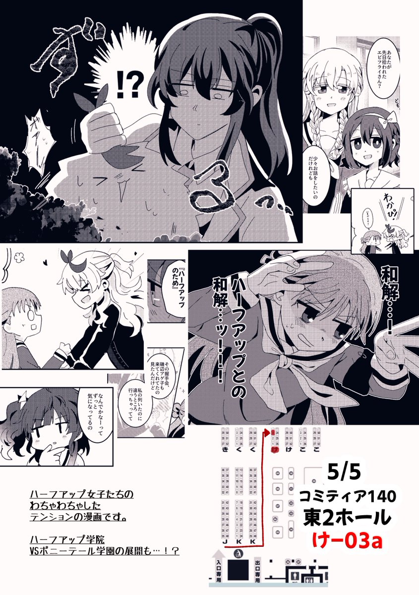 5/5コミティアのお品書きとマップです! 東2ホール【く-21a】にて頒布予定です🙇♀️ 白衣とハーフアップとポニーテールの百合が色々あります! #COMITIA144 #コミティア #コミティアお品書き