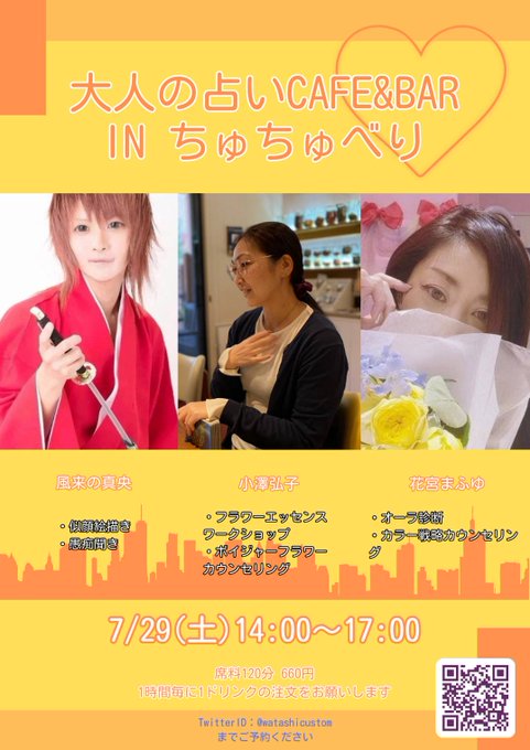 2 3 ・システム ワンタイチャージ600+1ドリンク以上のご注文をお願い致します。 鑑定料、イラストは各先生方に直接お支払いください。 🥀3/28の出展者さん #イラスト #似顔絵 #愚痴聞き 風来の真央さん @miragemao2012 #カラーセラピー #オーラ診断 他 花宮まふゆ @mafuyunohana0 23/03/27 18:07
