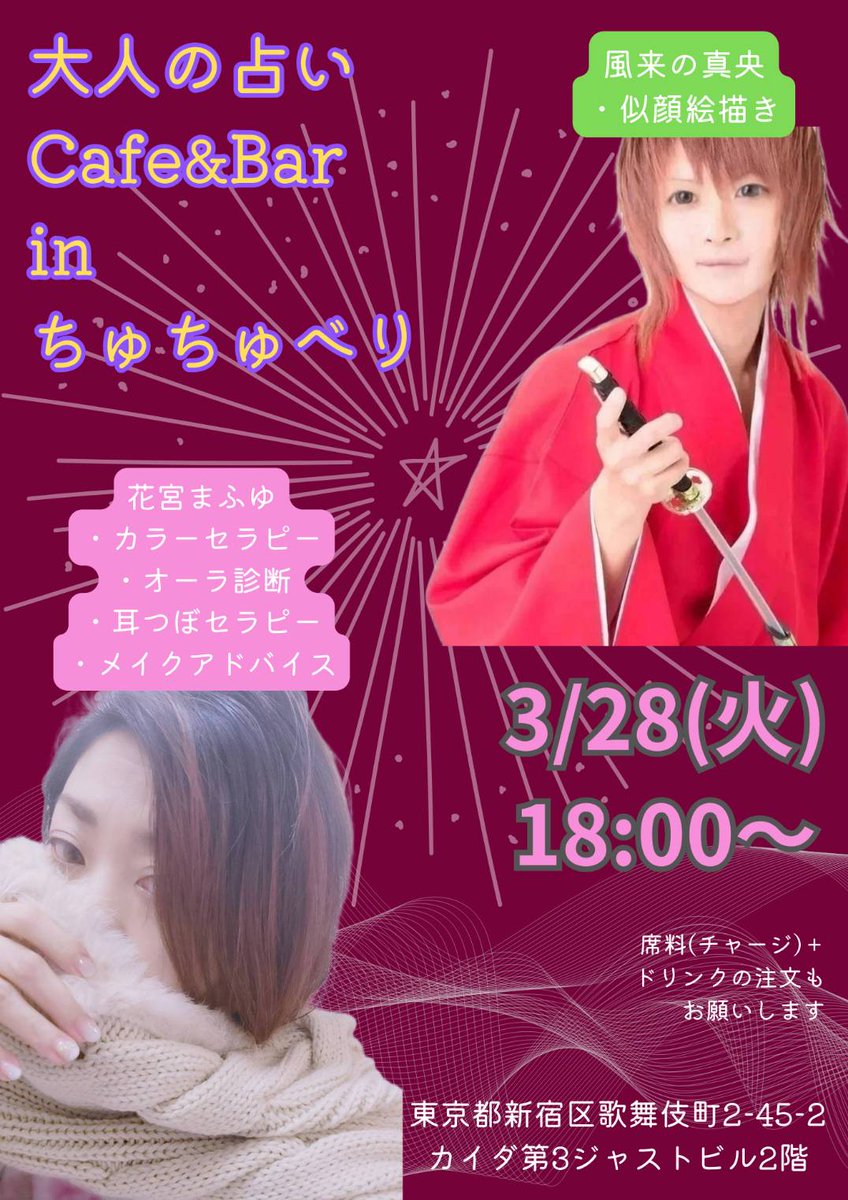 🥀緊急開催!!! 3/28 火 【大人の占いCafe&Bar】 ミニミニ開催です。 #イラスト #似顔絵 風来の真央さん @miragemao2012 と #オーラ診断 他 花宮まふゆ @mafuyunohana0 のツーオペでバー営業しちゃいます🍸 ミニミニ開催だけど中身は充実! お待ちしております!