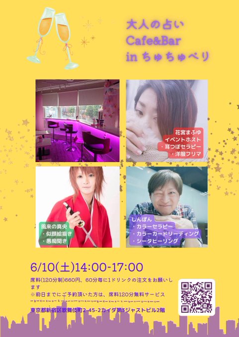 4 7 6/10(土) 14:00〜は 【大人の占いCafe&Bar】inちゅちゅべり🔮 #カラーセラピー #カラーリーディング #シータヒーリング しんぽん先生 @shimpon_2416 #似顔絵 #イラスト 真央さん @miragemao2012 と まふゆさんが #耳ツボセラピー とお洋服をフリマ形式 でご提供します。 23/06/06 03:42