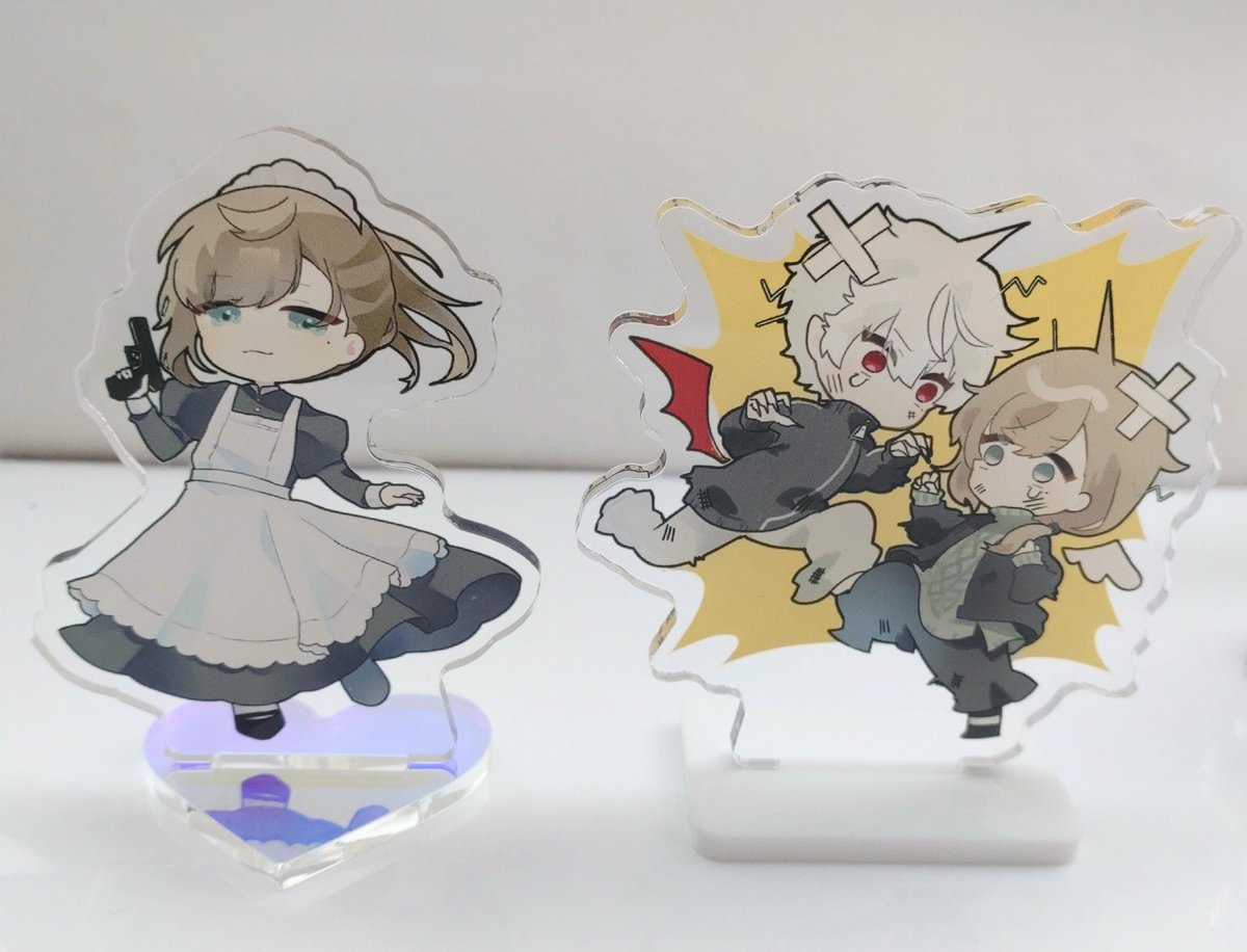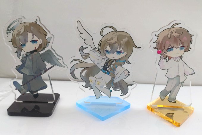 13 132 #にじそうさく07 にて配布する グッズ現物です〜! ※お品書きのものより少々明るくなっております! 🍬💃はゴールドミラー メイドはオーロラ台座です✨ よろしくお願いいします〜☺️ 23/05/02 12:55