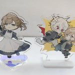 #にじそうさく07 にて配布する グッズ現物です〜! ※お品書きのものより少々明るくなっております! 🍬💃はゴールドミラー メイドはオーロラ台座です✨ よろしくお願いいします〜☺️