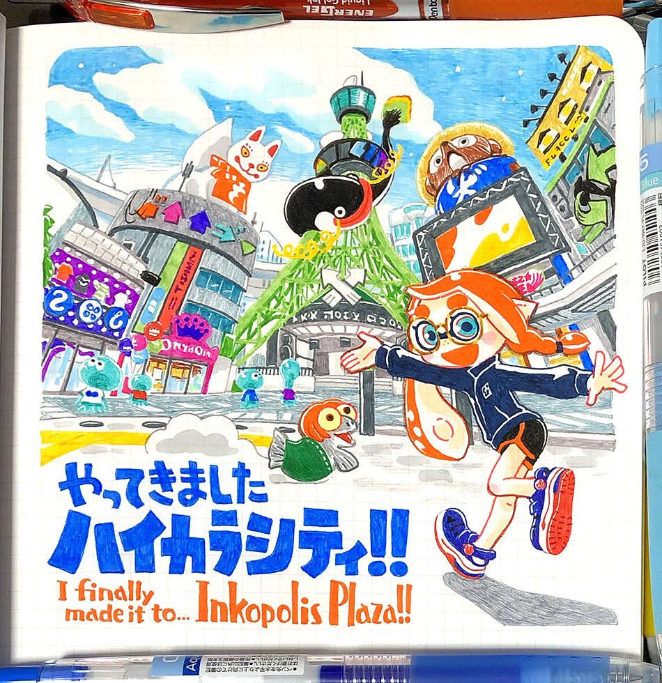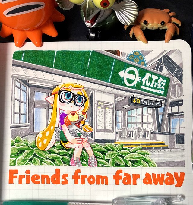 久しぶりにボールペンで描きました。 今日は遠く離れた友達が電車でやってくるとのことで、駅でソワソワしながら待っているグラッシーちゃんです。 #スプラトゥーン3 #Splatoon3 #今日のグラッシーちゃん