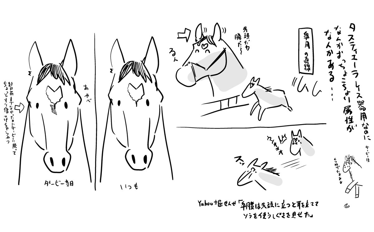 色々あったダービーで気持ちの整理が難しいレースだったな…という感じでしたが、誰も悪くないのでせめて全馬がんばってくれて楽しかったよの部分と差分とかおまけ。