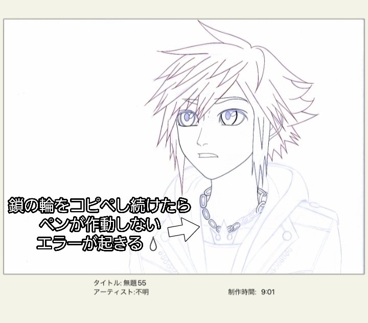 紙で描いた時にも1番苦戦したネックレスの鎖⛓️ 形が似た絵が幾つかあるので効率よくコピペしてみる事に📲 でもし続けたらペンが描けなくなるエラー発生‼️ これがアイビスの限界⁉️ #イラスト好きさんと繋がりたい #絵描きさんとつながりたい #キングダムハーツ #デジタルイラスト #アイビスペイントX