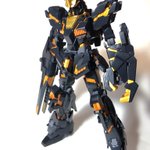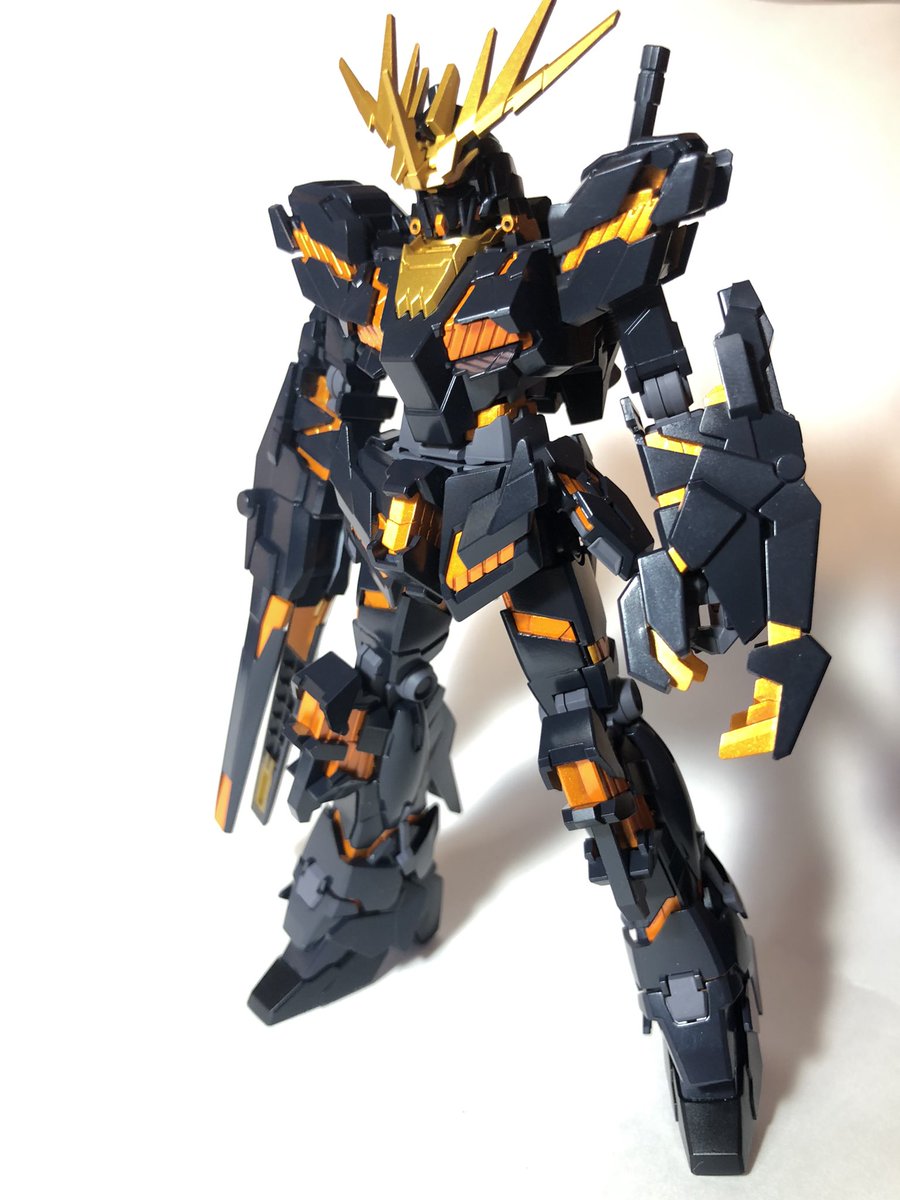 過去作5 HGバンシィデストロイモード全塗装 パーツが多くて塗りも組立ても骨が折れました。 サイコフレームはガイアノーツのスターブライトゴールドの上に蛍光クリアオレンジ、溝にはリアルタッチマーカーで追いオレンジ。 #ガンプラ #ガンプラの画像貼るとRTされると聞いて
