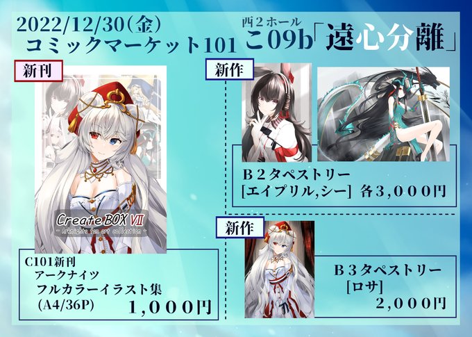 【告知】 コミックマーケット101のお品書きでっす。 12月30日(金)、西2ホール こ-09b「遠心分離」にてお待ちしております。 どうぞよろしくお願いいたします。 #C101 #C101お品書き #C101告知
