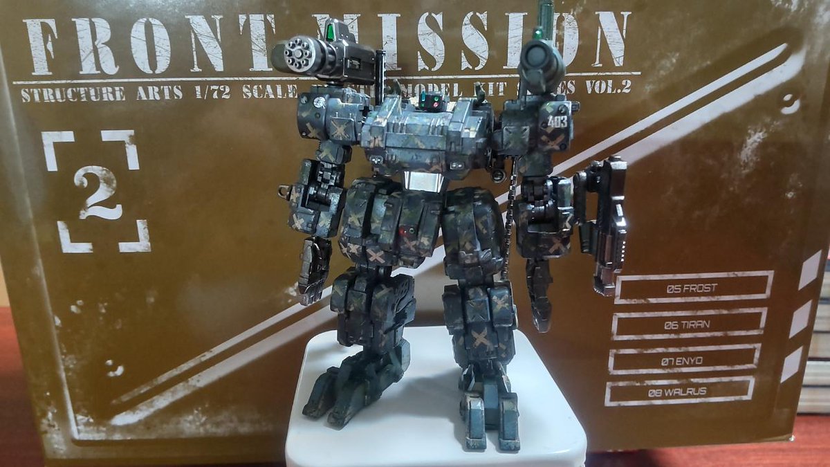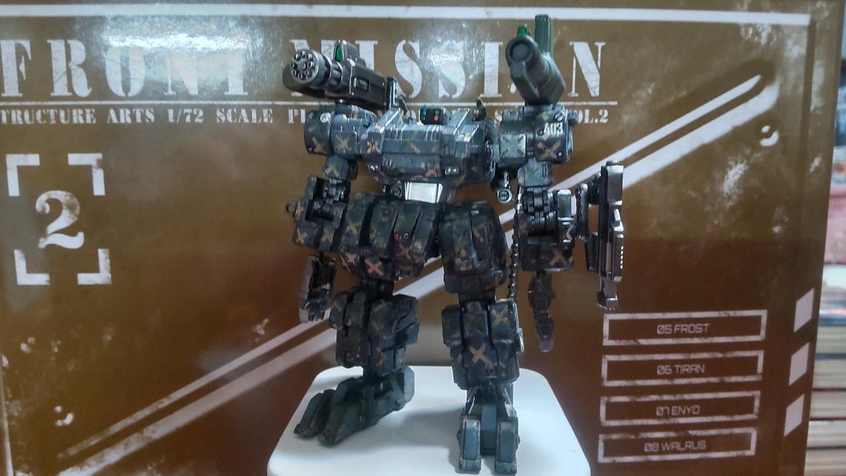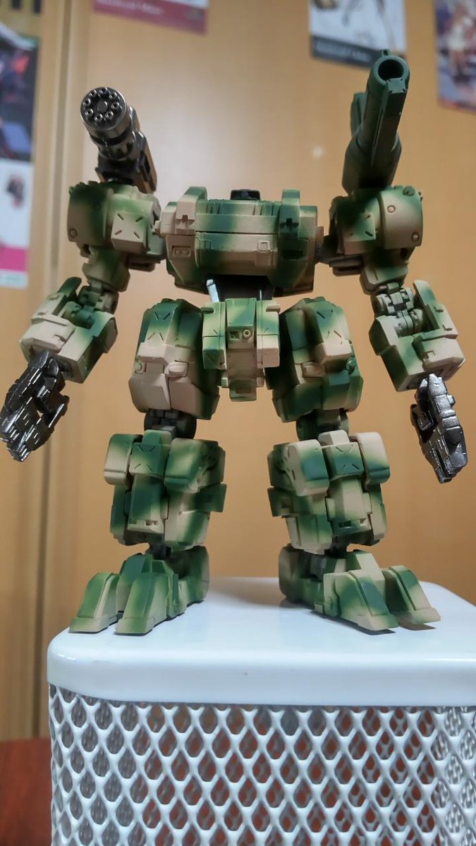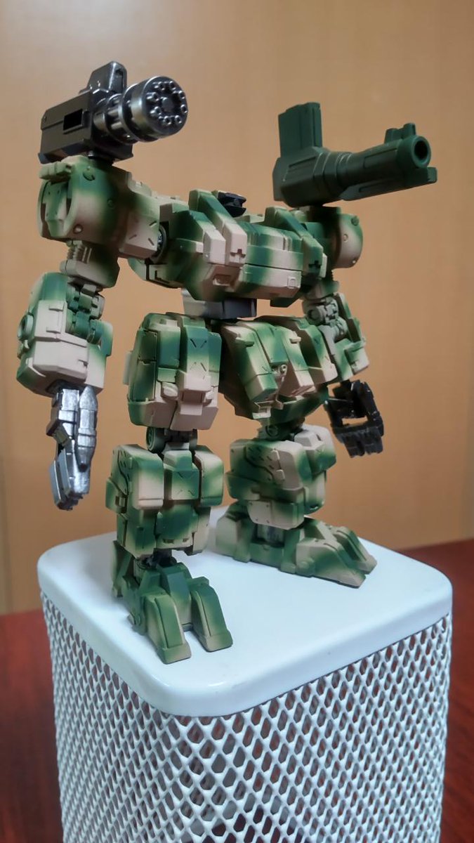 #今月作ったプラモ晒そうぜ と言いながら2月の完成品① フロントミッション ストラクチャーアーツ 1/72 Vol.1のNumsekar/ナムスカル 迷彩2層目塗ったら… なんだかよくわからん仕様になっちゃった。 現地でサンド系の迷彩施し、 急遽夜間潜入ミッション向けに塗った設定です。