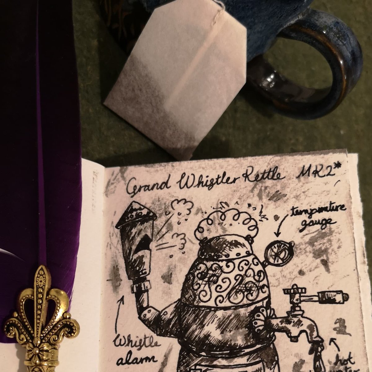 Day 06 is Kettle and since Perilla absolutely loves tea (just like her creator @CLScottAuthor) you just know she has the perfect kettle invention for all your tea needs! #inktober #perillamagilla #steampunkart #inkpenartist