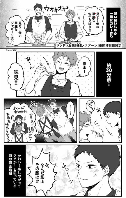 ワンドロお題「味見・スプーン」 (同棲設定の影日) 初参加シツレイシアーッス!!何でも競いながら一緒に家事炊事をこなす影日っていいよなぁ☺️✨ #影日ワンドロ @kagehina_d_w