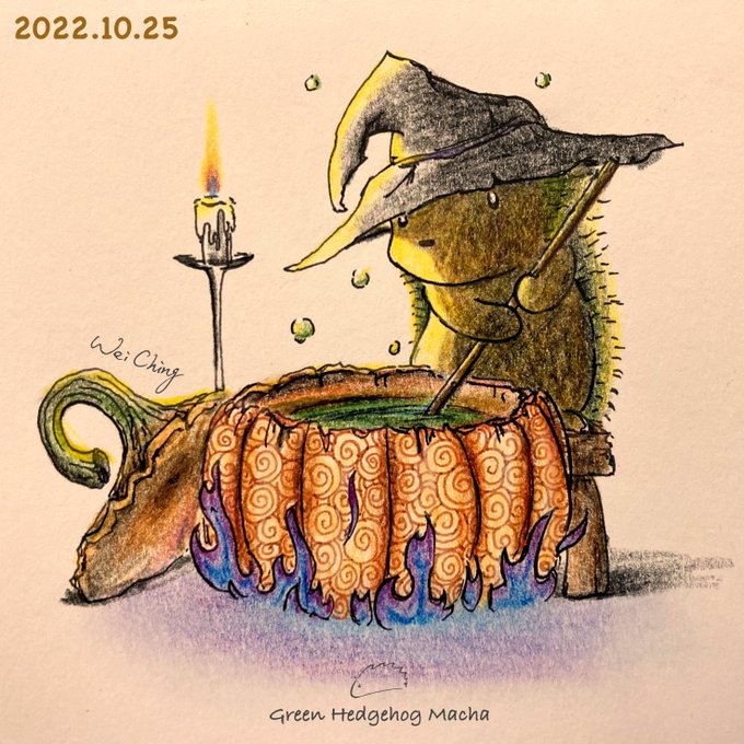 萬聖節將近來畫幾張好了。日子還沒到,只好先慢慢熬,熬出頭就是你的?! 過程還是要休息一下,不然手痠了、腳麻了、身體僵了,再熬下去是在哈囉?!HALLOWEEN~ #萬聖節 #halloween #hedgehog #illustration #hedgehogs #刺蝟 #ハリネズミ #插圖 #綠刺蝟麻恰 #手繪 #greenhedgehogmacha #色鉛筆