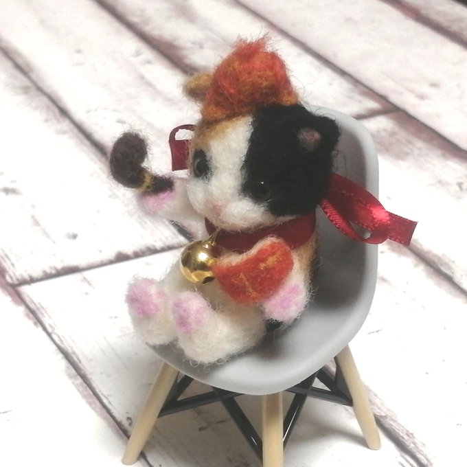 我がにゃは三毛猫ホームズにゃ! マタタビ入りパイプがお気に入りにゃ。 今日の晩御飯をこの鋭い(?)眼光と鼻で推理するのにゃ! #名刺代わりに代表作を置いておく #羊毛フェルト #シャーロック・ホームズ #三毛猫ホームズ